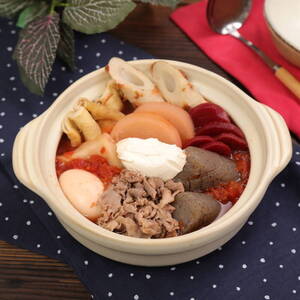<5>、サワークリームをのせ、軽く煮立たせたら器に盛り付ける。