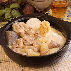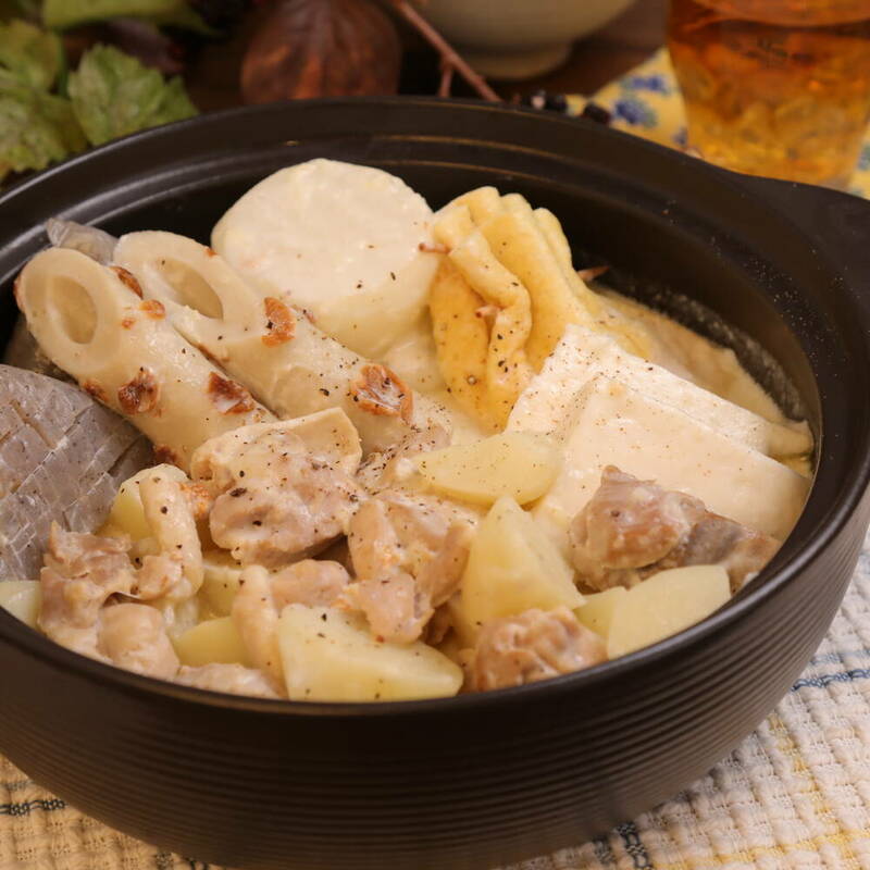 コンソメを加えてひと煮立ちさせ、大根、こんにゃく、はんぺん、ちくわ、餅巾着を加えて弱〜中火で4〜5分煮込む。