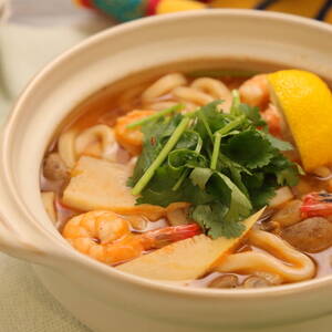 えびの色が変わったらうどんを入れてほぐしながら入れ、弱火で3~4分ほど煮込む。