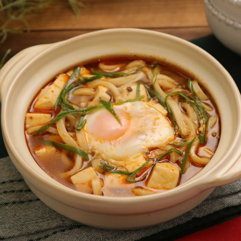 【A】、豆腐を加えてふたをする。ひと煮立ちしたらうどんを加えてほぐし、再度ふたをして弱火で3〜4分ほど煮込む。