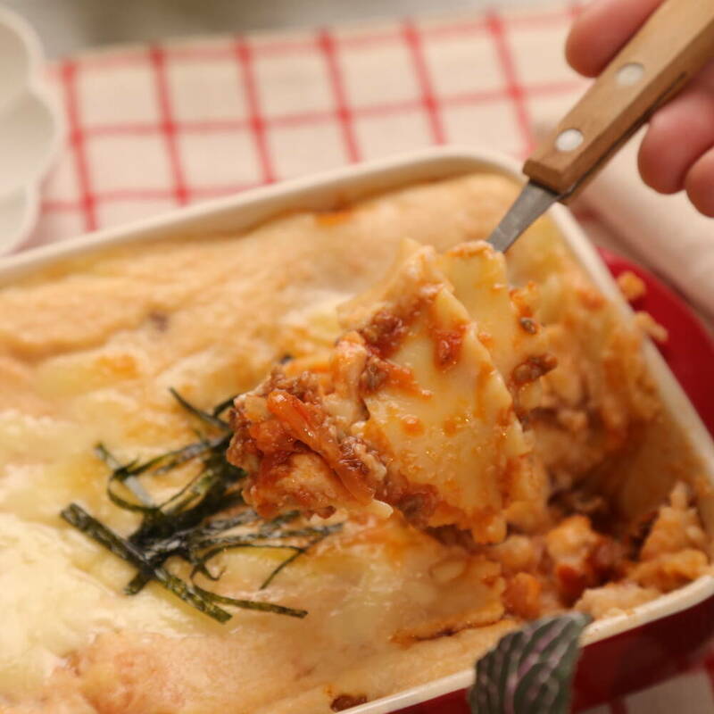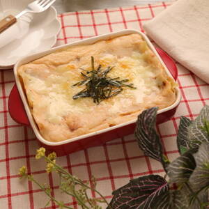 2層目、3層目も同様に重ね、上面にピザ用チーズをかける。トースターでチーズがとけるまで焼く。(約5分)仕上げに刻みのりを乗せる。