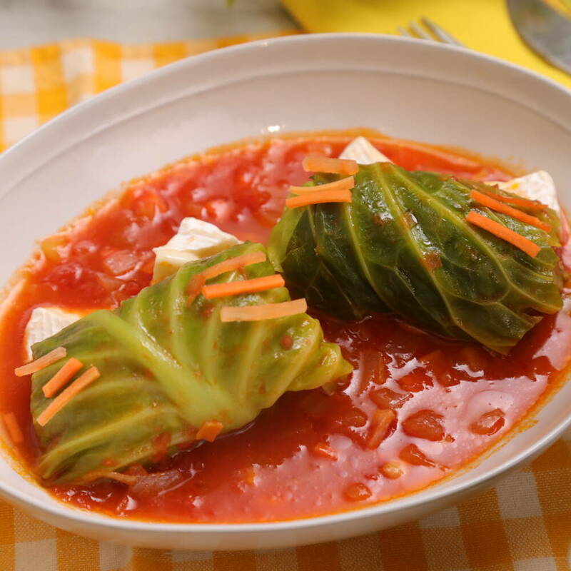 器にロールキャベツを盛りつけ、スープを注ぐ。カマンベールチーズとにんじんで猫にする。