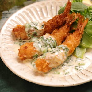 <4>をエビフライにかけ、お好みでゆずこしょうをのせる。