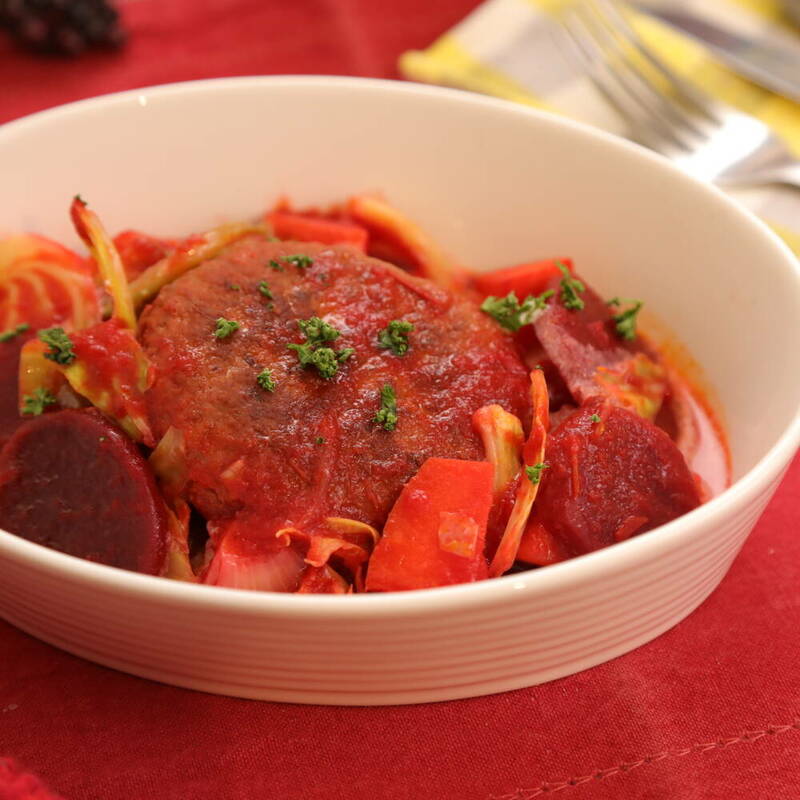 しんなりしたら赤ワインを加えてアルコールを飛ばす。【B】、<2>、キャベツを加える。