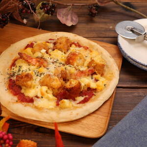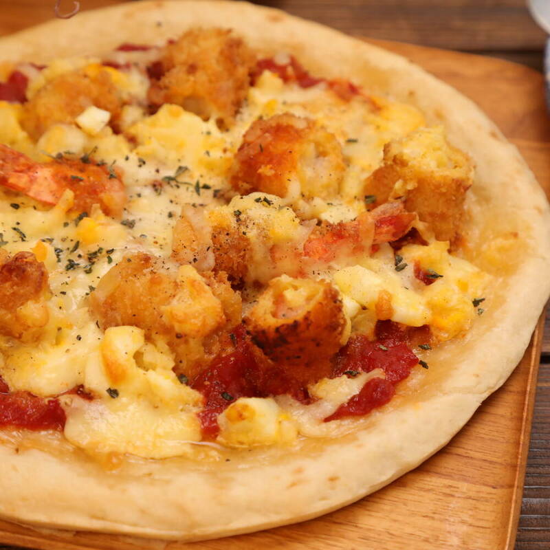 【組み立て】ピザ生地にトマトソースを塗る。エビフライを一口大に切って散らし、タルタル、チーズをかける。