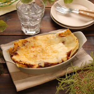 耐熱皿にオリーブオイルを塗り、ラザニアをひき、<4>、<2>を順に広げながらのせる。