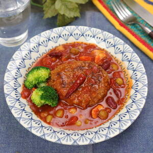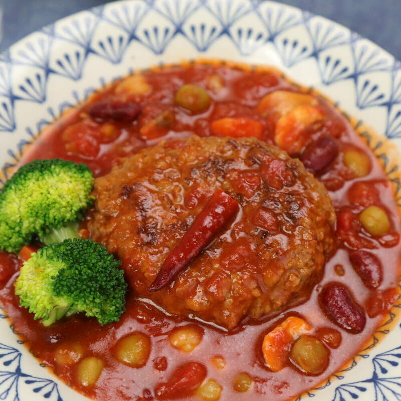 【B】を入れひと煮立ちしたら、<3>、<6>、ミックスビーンズを入れる。弱火に落とし、時々煮汁をかけながら7分煮込む。