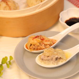 フライパンの高さ半分程度のクッキングシートを広げ、5個ずつ並べる。湯(分量外)をクッキングシートの下に注ぎ、ふたをして中火で4分蒸す。(ふたは平ではなくサイズがぴったり合うアーチ状のものを使用してください。水滴が小籠包につくと水っぽくなります。)