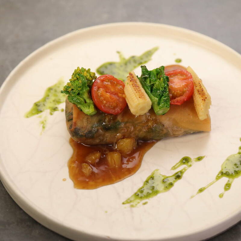 器にバジルソースをスプーンでランダムに乗せ、中央に春巻きを置く。
