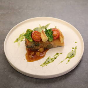 オレンジソースをかけ、ミニトマト、ヤングコーン、なばな をトッピングする。