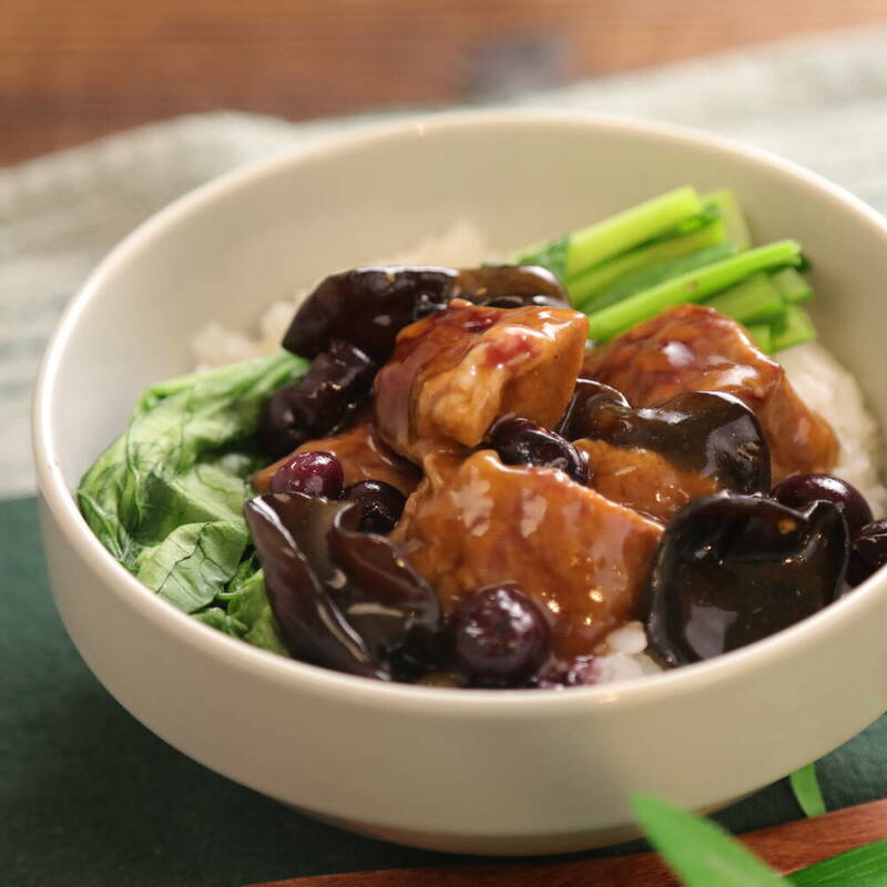 器にご飯を盛り付け、<4>、<5>をかける。青梗菜を添える。