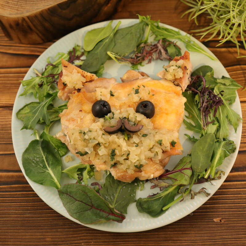 お皿の周りにベビーリーフをおき、真ん中にチキンを盛り付け、<8>をつける。<7> を豆柴の毛の白い部分におき、眉の部分にも置く。