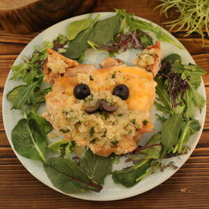 ブラックオリーブ2つは半分に切り、目にする。1つは輪切りに4等分に分け半分に切り、口にする。