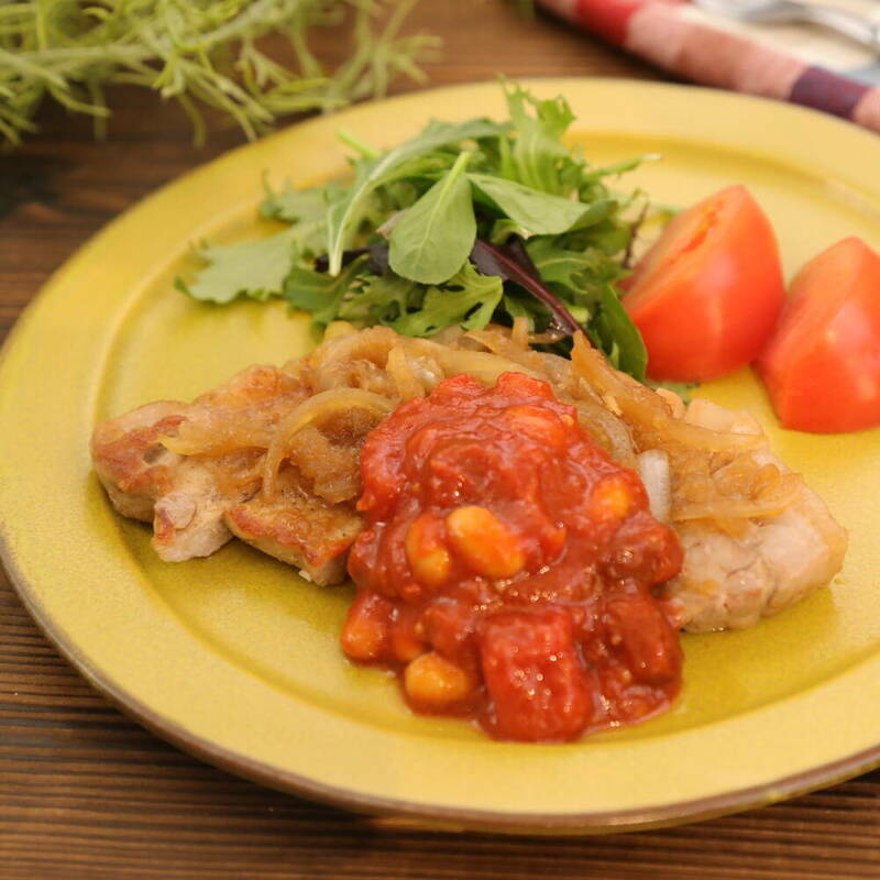 玉ねぎは半分は薄切り、残り半分はすりおろす。しょうがはすりおろす。付け合わせのトマトは、くし切りにする。