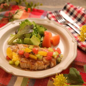 食べやすい大きさに切り分け、器に盛り付け、<1>を散らす。トマトとベビーリーフを添える。