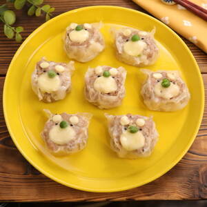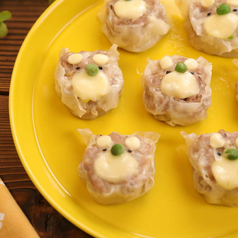 焼売の皮2枚を水(分量外)で濡らしつなぎ合わせる(長方形になるように)。<3>を中央にのせて耳を作りながら包み形を整える。同様に合計14個つくる。(一人7個)