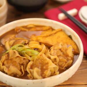 うどん、しゅうまいを加えて軽く煮込み、器に盛り付ける。お好みで七味をトッピングする。