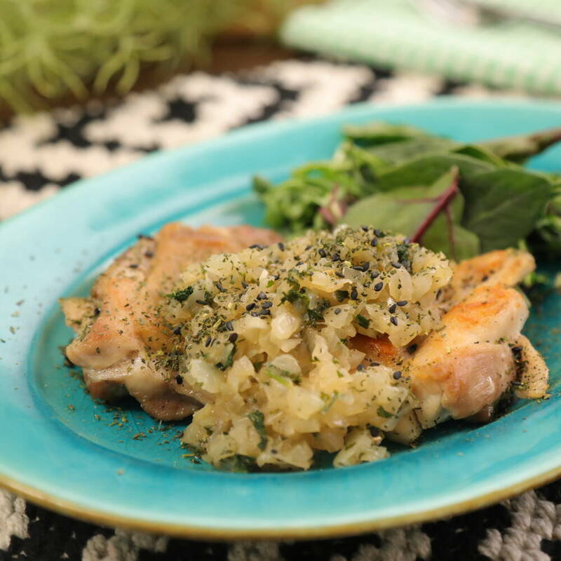 皿の奥にベビーリーフをおき、手前に<5>をおく。チキンの上に<7>をのせ、黒ごまと<1>をかける。