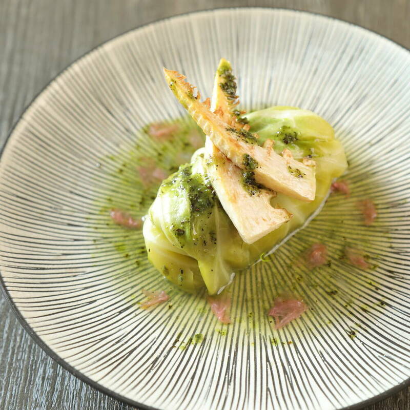 【盛り付け】器にロールキャベツを盛り、コンソメスープを適量注ぐ。たけのこをロールキャベツの上に重ねるようにして盛り付ける。