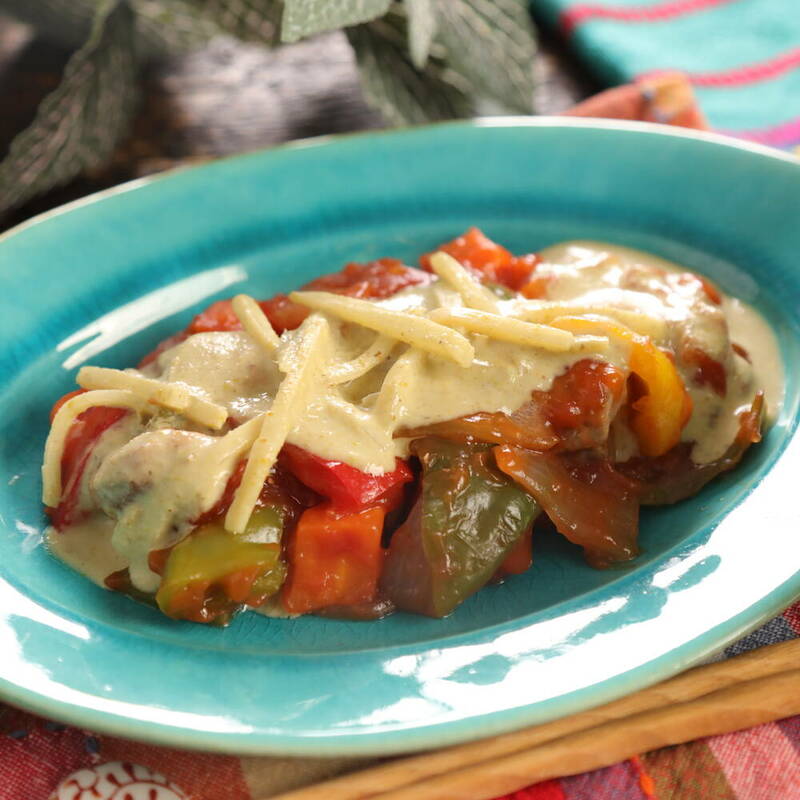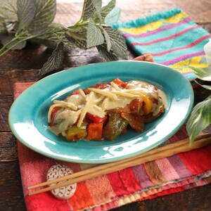 フライパンにオリーブオイル(分量外)を入れ、<4>を入れて中火で熱する。全体にカリッと焼き色がついてきたら玉ねぎ、ピーマンを炒め合わせる。