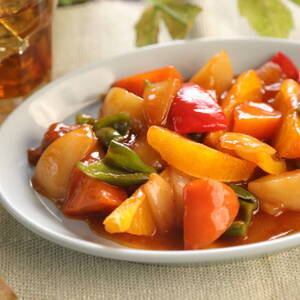 とろみがついたらオレンジ、ももを加えてさっと加熱し、器に盛り付ける。