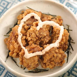 器にご飯を盛り付け、刻み海苔をしいて唐揚げをのせる。<8>でハートになるように絞る。