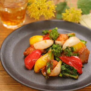同じフライパンに、パプリカ、玉ねぎ、なばなを入れて、油が回ったものから取り出す。