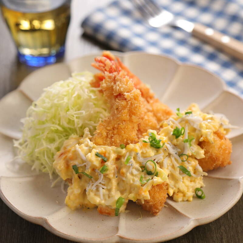 薄力粉、溶き卵、パン粉の順に衣をつけ、中温に熱したサラダ油で揚げる。