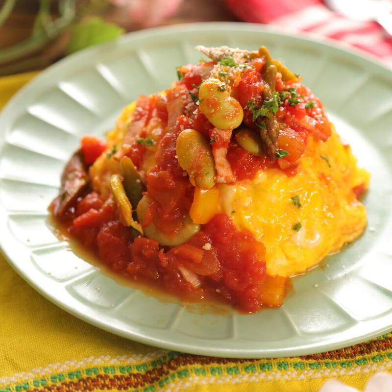しんなりしたきたらアスパラ、そら豆を加えて炒めて塩少々(分量外)する。焼き色がついてきたら【A】を加えて、水分が半分程度になるまで煮詰める。