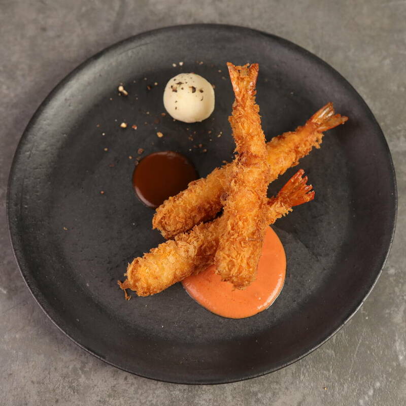有頭海老の頭と殻をとり、背側を開いて背わたをとる。流水でよく洗い流し、水気を拭き取る。