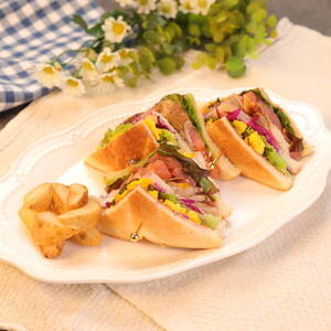 食パン→グリーンリーフ→トマト4切れ→<4>→食パン→<7>→グリーンリーフ→<5>→食パンの順にのせ、サンドする。