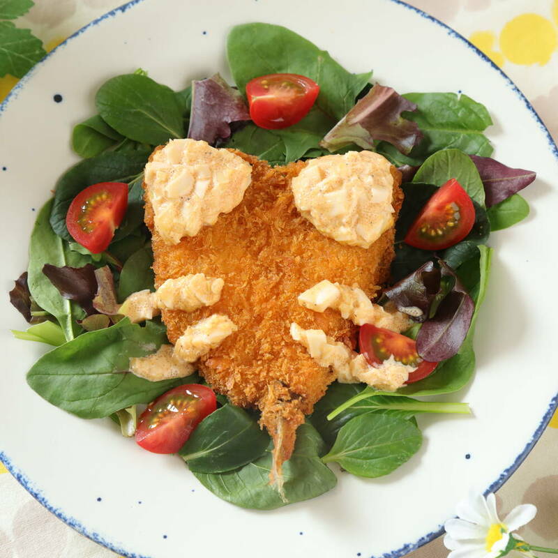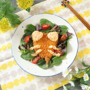 器に付け合わせ野菜、<7>を盛り付けて、<4>を耳、ひげに見立ててのせる。