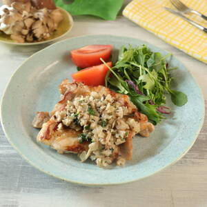 フライパンにオリーブオイルをひいて中火で熱し、鶏肉の皮面を下にして焼く。皮にしっかり焼き色がついたらひっくり返す。