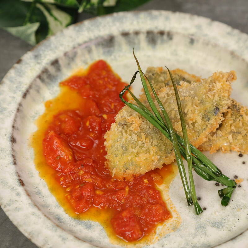 器にアジフライ、青ねぎを盛り付け、トマトソースをかける。