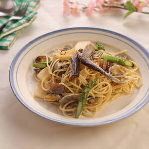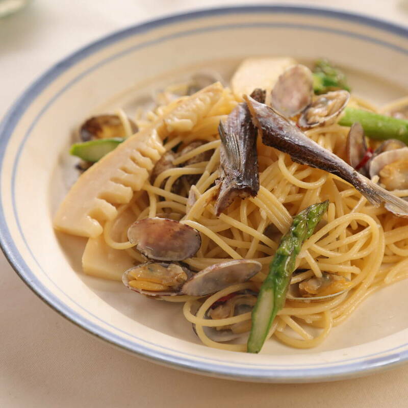 <8>を戻し入れ、さっと混ぜ合わせながら、オリーブオイル(分量外)を少々加え温め、混ぜながら、スパゲッティとソースを混ぜ合わせる。器に盛り付けて、あご煮干しを添える。
