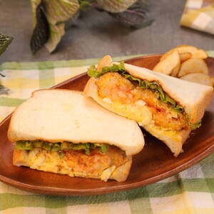 ラップを大きめに敷き、中央に食パンを置き、<1>大さじ1を塗り、グリーンリーフを乗せる。上に<6>をおき、<8>をかけ、さらに食パンでサンドし、ラップで包む。(5分〜そのまま)