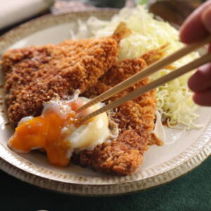器にアジフライを盛り付け<1>をかける。温泉卵を添えて白ごまを散らす。