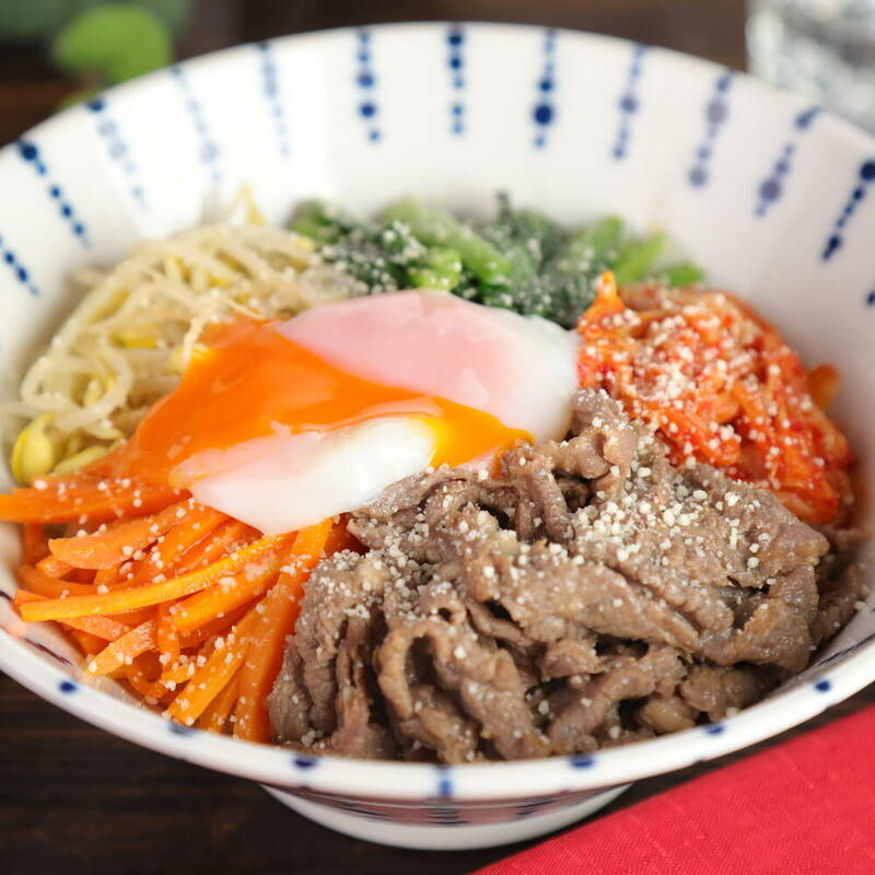 器にご飯を盛り、<4>、<6>、キムチを盛り、温泉卵をのせる。パルメザンチーズをふりかける。