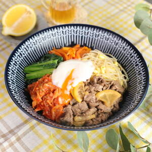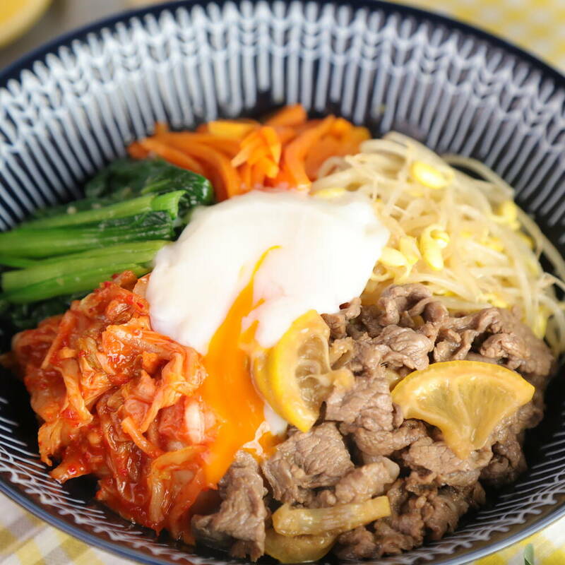 器にご飯を盛り、<6>、<8>、キムチを盛り、温泉卵をのせる。