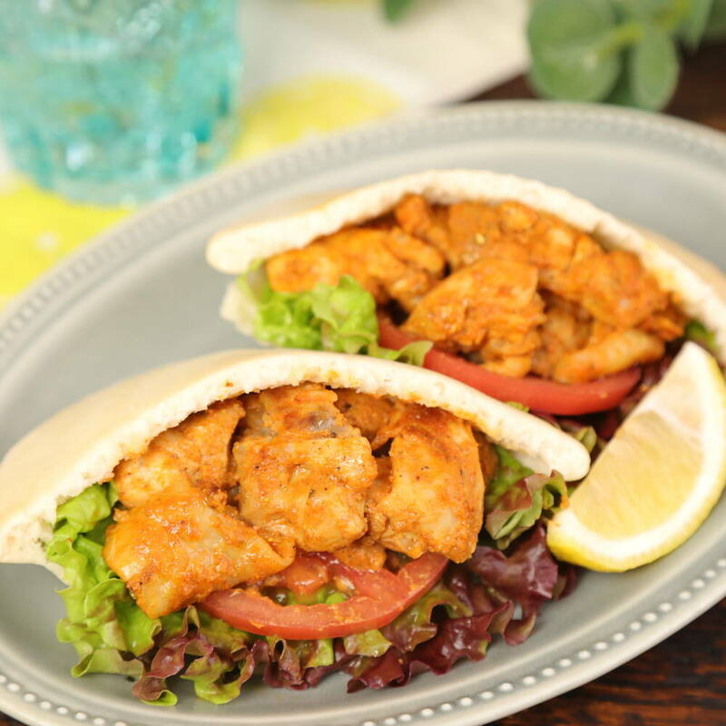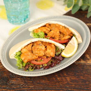 ピタパンにグリーンリーフ、トマトを入れ、<6>を挟む。レモンを添える。