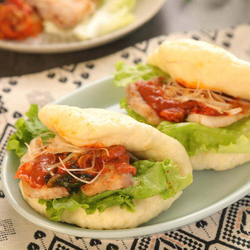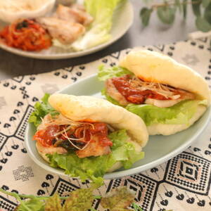 パオにレタス、豚肉、キムチ、白髪ねぎを挟み、味噌ダレをかける。
