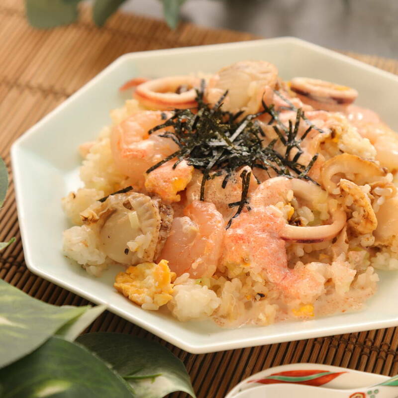 フライパンにサラダ油を入れて中火にかけ、えび、いか、ほたてを入れて炒め、塩、粗びき黒こしょうをふる。