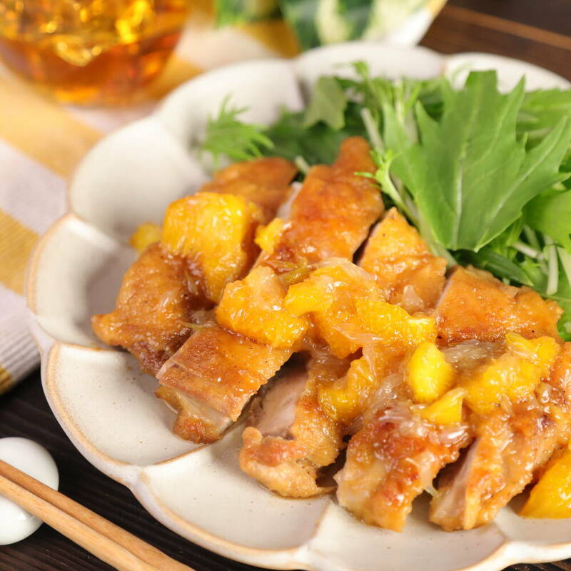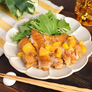 弱めの中火で、鶏肉に火が入るまで加熱したら<1>を回し入れる。煮汁を煮詰めながら鶏肉に照りをつける。フライパンから取り出す。