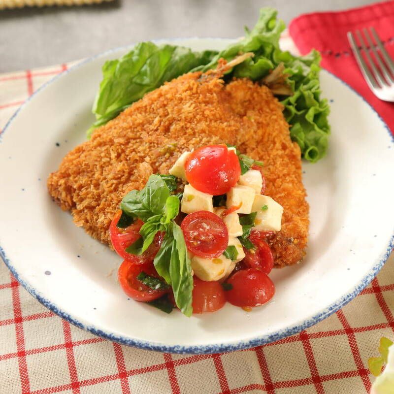 器にアジフライを盛り付け<ソース>をかける。飾りのバジルを添える。