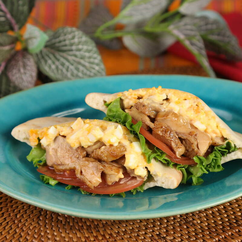 ピタパンにグリーンリーフ、トマト、<6>、<7>の順ではさむ。