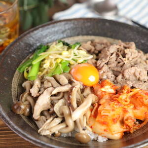 器にご飯を盛り、<9>、<4>、<7>、キムチを盛り、いりごまを散らす。卵黄をのせる。