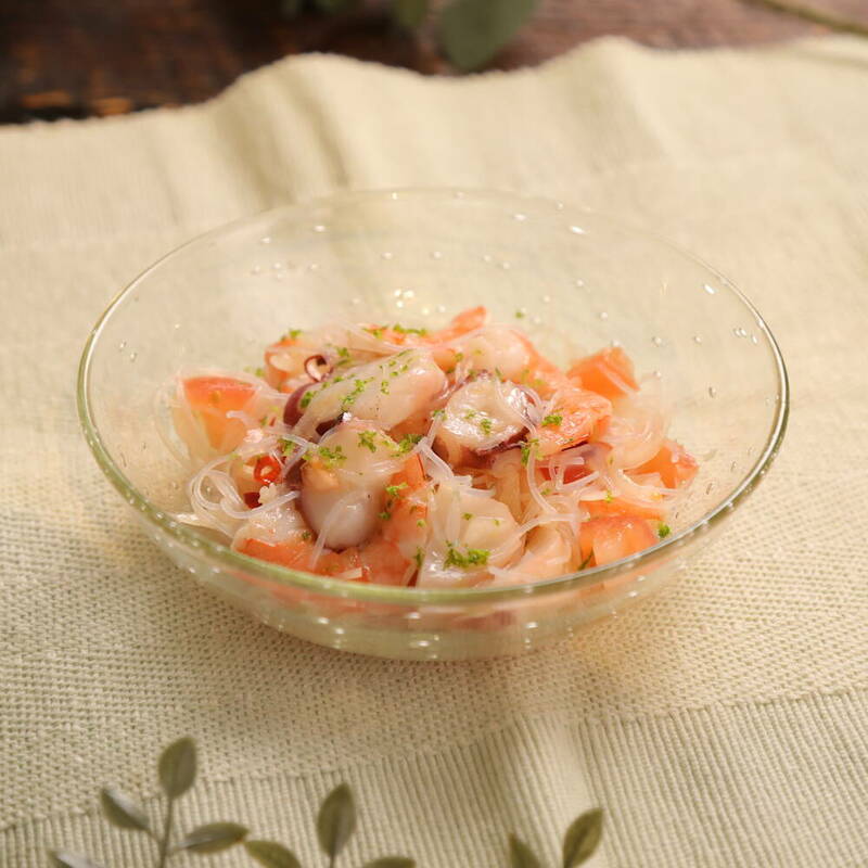 ボウルでライムの果汁、【A】を混ぜ合わせる。トマト、春雨、えび、たこを混ぜ合わせる。器に盛り付け、ライムの皮を削って散らす。