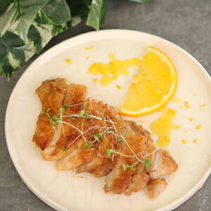 <5>の器の余白に半月にした甘夏をのせ、甘夏ソースをランダムにかける。<7>を散らし、チキンの上に根元を切ったブロッコリースプラウトを散らす。