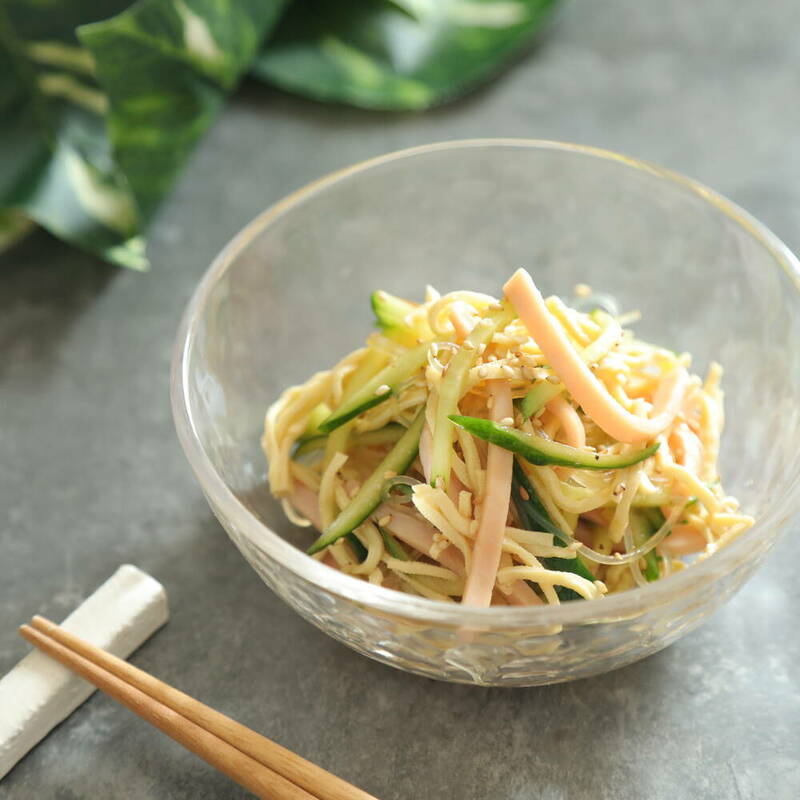 ボウルに緑豆春雨を入れ、<2>を春雨が浸るくらいまで注ぐ。5分程浸けて戻したら、湯を切って、流水ですすぎ、水気をしっかりと切る。
