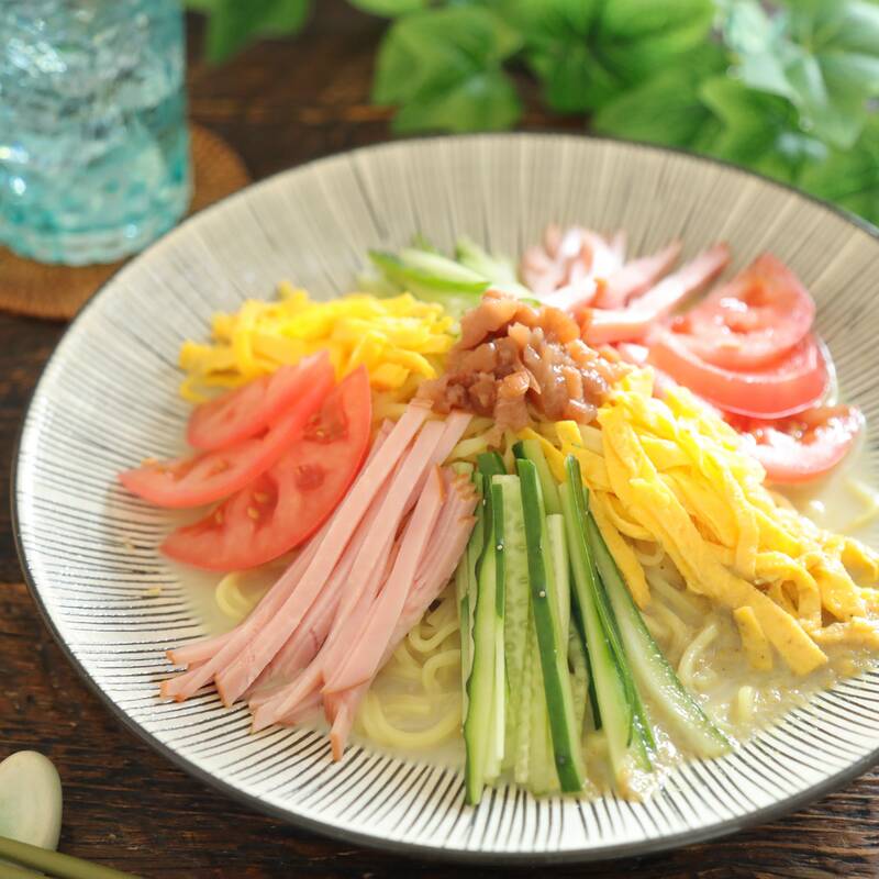 きゅうり、トマト、ハム、卵を盛り付ける。<2>をかけ、梅干しをトッピングする。